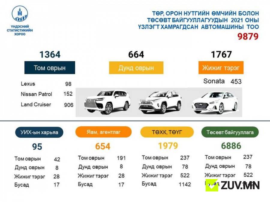 Төр, орон нутгийн өмчийн болон төсөвт байгууллагуудын (техникийн үзлэгт хамрагдсан) автомашины тоо 2021 оны жилийн эцсийн байдлаар 9879 байна.