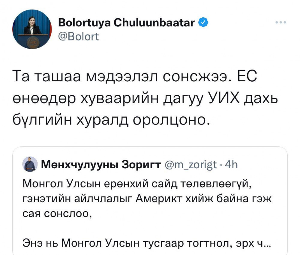 Тэгвэл үүнтэй холбогдуулан Ерөнхий сайдын хэвлэлийн төлөөлөгч Ч.Болортуяа өөрийн цахим хуудаснаа "Ташаа мэдээлэл сонсжээ. Ерөнхий сайд өнөөдөр хуваарийн дагуу УИХ дахь бүлгийн хуралд оролцоно" гэсэн юм. Өнөөдөр УИХ дахь бүлгийн хурал хуралдах товтой бөгөөд LRT төсөл болон төсвийн тодотголтой холбоотой асуудлыг хэлэлцэх юм.