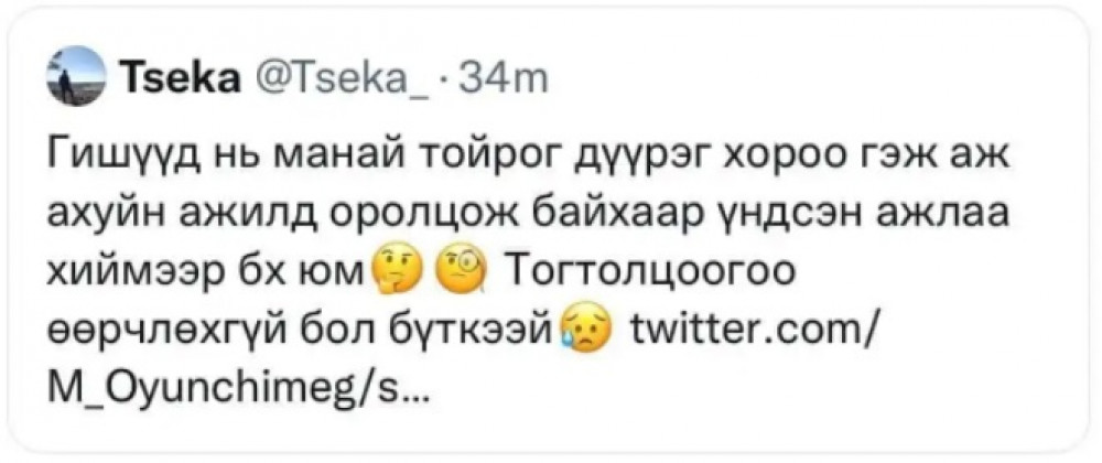Энэ 76-гаас чинь улсаа боддог нь 7-8-гаас хэтрэхгүй бна хөөе, бусад нь амин хувийн ажлаа л хийсэн шиг л суудаг ш дээ үнэндээ. Шударгын царай гаргаад л ярьж байгаа нь амь амьдралтай авцалдахгүй элэг хөшөөнө. Гэнэтхэн л бурхан, хөшөө... гээд гарч өгнө, түүнийгээ ард түмэн хүсэн хүлээж зүүднээс нь салахгүй зовоож бна гэх. Тэгснээ ажилгүйдлийг арилгаж байгаа нь гээд цахимаар гайхуулаад л нөгөө ажилгүйдэл нь хэвээрээ....