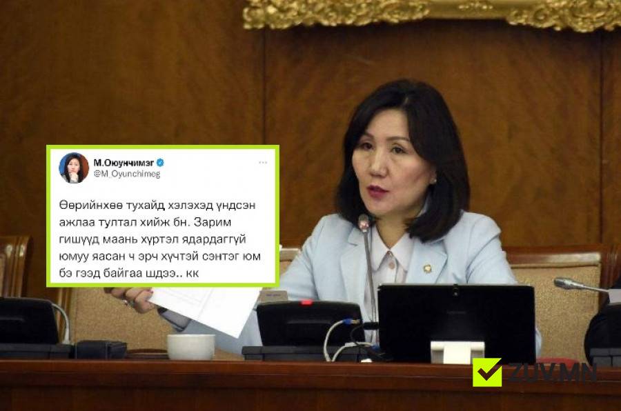 Тэгвэл М.Оюунчимэг өөрийн цахим хуудаснаа  "Өөрийнхөө тухайд хэлэхэд үндсэн ажлаа тултал хийж байна. Зарим гишүүд маань хүртэл ядардаггүй юм уу. Яасан ч эрч хүчтэй сэнтэг юм бэ гээд байгаа шүү дээ" хэмээн жиргэжээ.