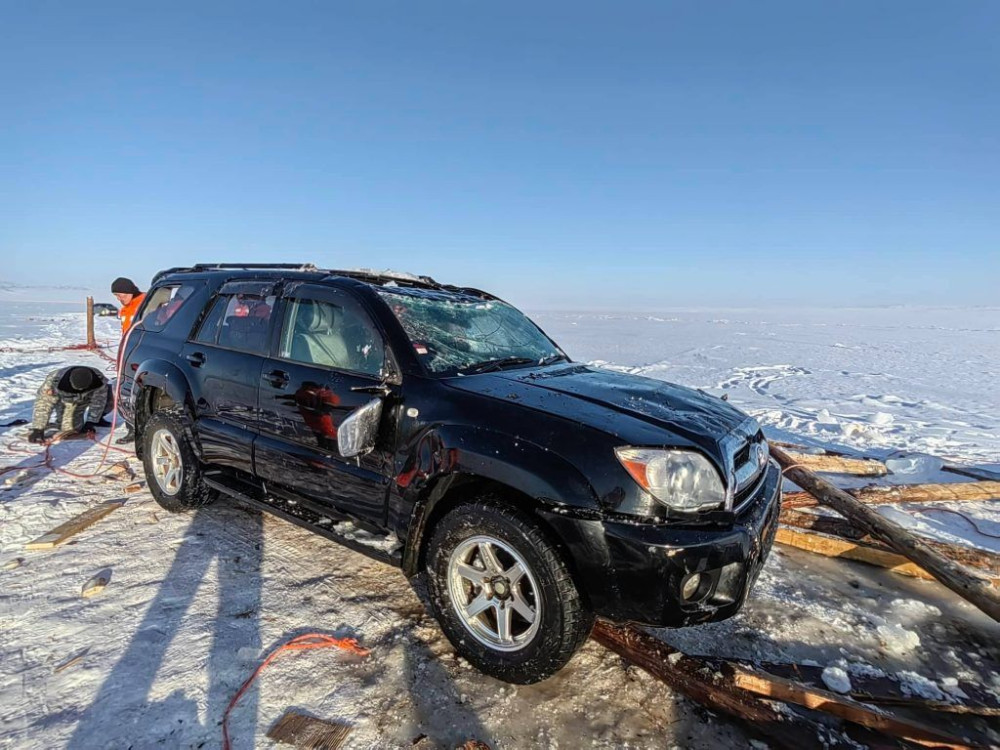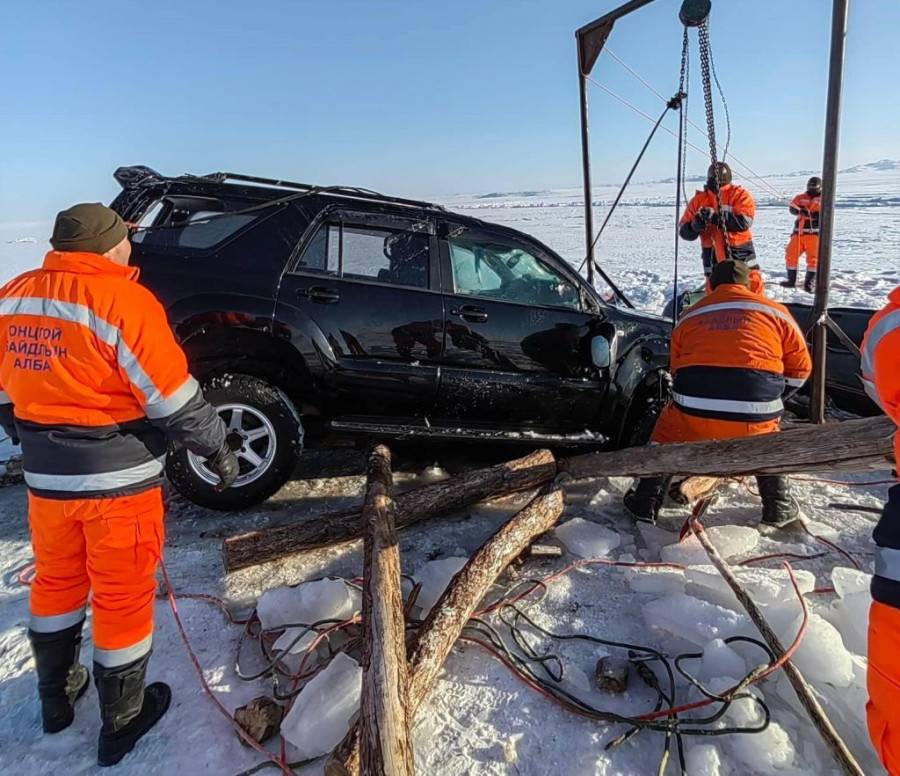 Алба хаагчид 18 метрийн гүнд шумбалт хийж, автомашиныг ган татлагаар холбон,  50 метр газар хонгил гаргаж мөсийг цэвэрлэн, татан гаргах ажиллагааг зохион байгууллаа гэж Онцгой байдлын ерөнхий газраас мэдээллээ.