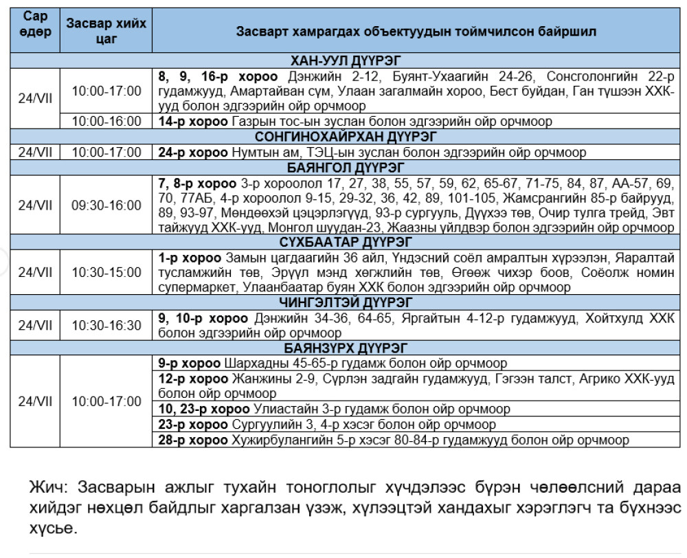 Өнөөдөр буюу 7-р сарын 24-ний даваа гарагт хийх засварын хуваарь